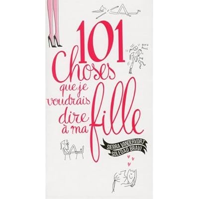 Un livre de filles (jeune fille ou mère de jeunes filles) pour des filles. Un livre qui défend des valeurs clé sur la femme, sur un mode léger et fun. Ce qu'on a appris en tant que femme et qu'on a envie de transmettre en tant que mère Un objet customisable (papier offset) et personnalisable par chaque maman Sierra Vandervort a 20 ans, elle est étudiante en journalisme à l'université de l'Indiana, USA. Elle publie ses tribunes dans la rubrique PARENTS de la version américaine du HuffingtonPost. Elle vit actuellement à Bloomington, dans l'Indiana et rêve après ses études de voyager et de s'installer à New York pour écrire. La très parisienne illustratrice Soledad était directrice artistique d'une agence de publicité avant d'entamer une étroite collaboration avec le magazine Elle au travers de divers personnages qui s'installent au fil des pages, et aujourd'hui dans une page de BD que l'on retrouve toutes les semaines Ce qu'elle aime par dessus tout, c'est se renouveler et toucher à tout : imaginer des histoires pour les tout petits à l'Ecole des loisirs, inventer un personnage féminin pour la collection les paresseuses chez Marabout, créer des assiettes pour Petit Jour, exposer ses dessins, très grands, taille mannequin, chez Colette ou encore tenter d'alimenter son blog quotidiennement.Broché=144 pages. Editeur =Solar (14 octobre 2015). Collection =Hors collection. Langue =Français. ISBN-10=2263071733. ISBN-13=978-2263071737. Dimensions du produit=10,2 x 1,5 x 18,1 cm. Moyenne des commentaires client =3.1 étoiles sur 5 11 commentaires client. Classement des meilleures ventes d'AmazonGrossesseFemmes=26.410 en Livres (Voir les 100 premiers en Livres) .zg_hrsr { margin: 0; padding: 0; list-style-type: none; } .zg_hrsr_item { margin: 0 0 0 10px; } .zg_hrsr_rank { display: inline-block; width: 80px; text-align: right; } n°66 dans Livres > Famille, Santé et Bien-être > Parents et famille > Relations familiales > Maternité > n°82 dans Livres > Santé, Forme et Diététique >.Un petit bouquin avec des phrases de la vie; soit c' est écrit en gros caractère, facile à lire, mais tellement réel, plein d' amour. A lire à deux, pour plus de complicité!!! Je recommande. Déçue peu d'intérêt à l'écrit sympa pour l'illustration , je l ai trouvé peu crédible en réflexion peu être ne suis je pas assez " in". Une phrase par page et encore en grosses lettres ! livre terminé en 10 minutes à peine.Dommage le titre donne envie de le lire. Top à offrir à sa fille sans modération !Très sympa rigolo et tellement vrai.À lire et relire !. Petit clin d'œil à ma fille, tantôt teinté d'humour tantôt sérieux, voilà quelques unes des choses que je voudrais dire à ma fille ... C'est fait!! Merci.